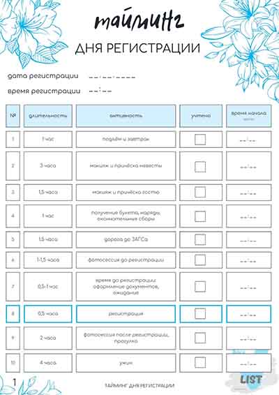 Когда стилист сказала мне, что в день регистрации мне надо будет встать в 6 утра, я решила, что она просто меня пугает. Церемония аж в 14:30! Вставать за 8,5 часов? Зачем? Чтобы всё проверить, я и составила этот тайминг. И именно после этого я поняла, почему всё-таки стоит разнести свадьбу и регистрацию на два отдельных дня